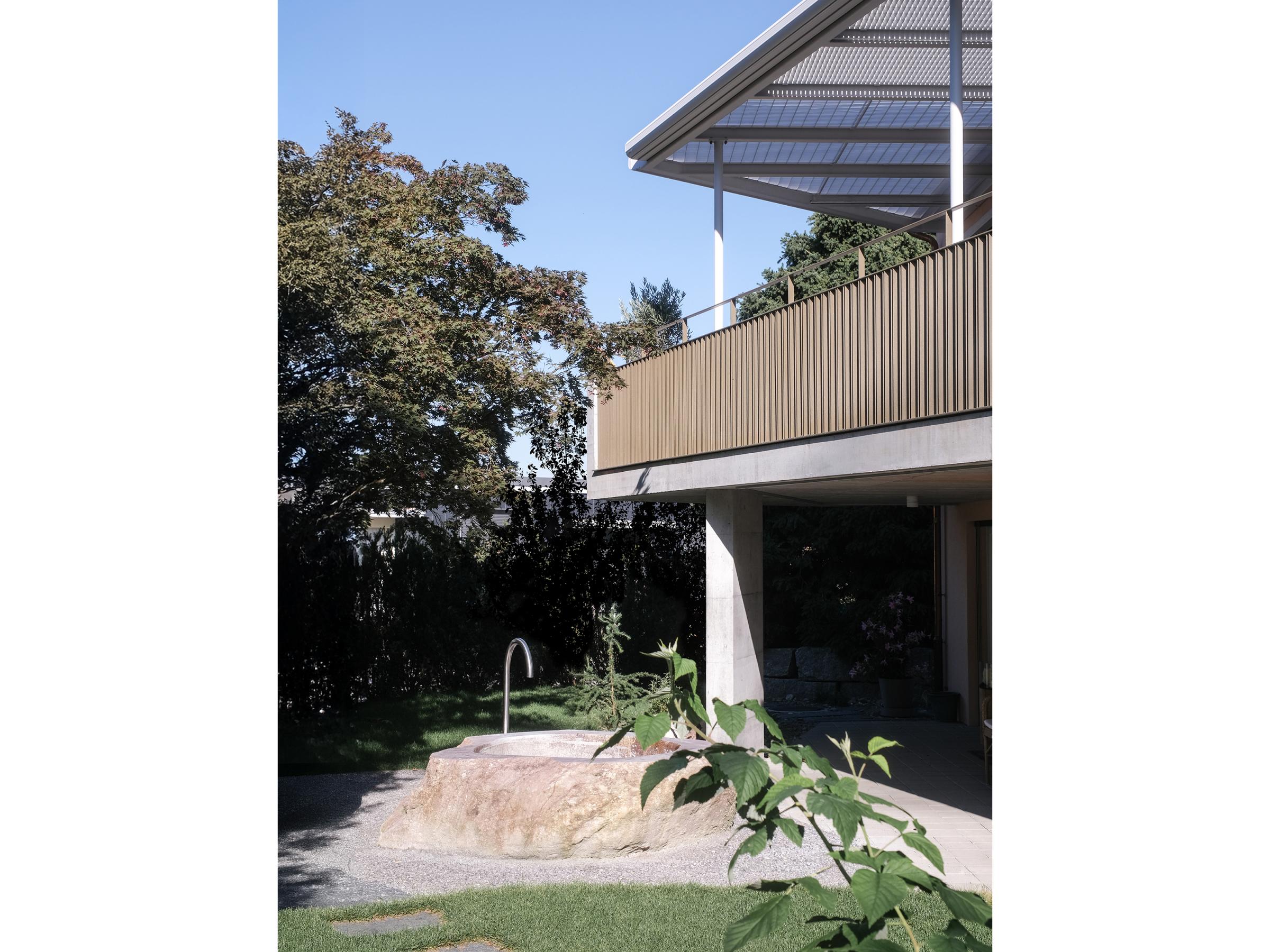 Das bestehende Wohnhaus wurde vollständig auf den Rohbau zurückgebaut. Feine Grundrissanpassungen bilden die Grundlage für die neuen Anforderungen an die Nutzung. Zusätzlich zu den Anpassungen in Bezug auf Haustechnik und Wärmedämmung wurde das Haus um einen Garagenanbau sowie eine grosszügige Terrasse auf der Südseite ergänzt. Unter der Terrasse befindet sich ein überdachter Bereich im liebevoll gestalteten Garten. Über der Terrasse bietet eine Pergola Schatten. Lamellenroste zwischen der Tragkonstruktion werfen je nach Sonnenstand und der darauf abgestimmten Ausrichtung der Lamellen in definierten Bereichen der Terrasse Schatten.