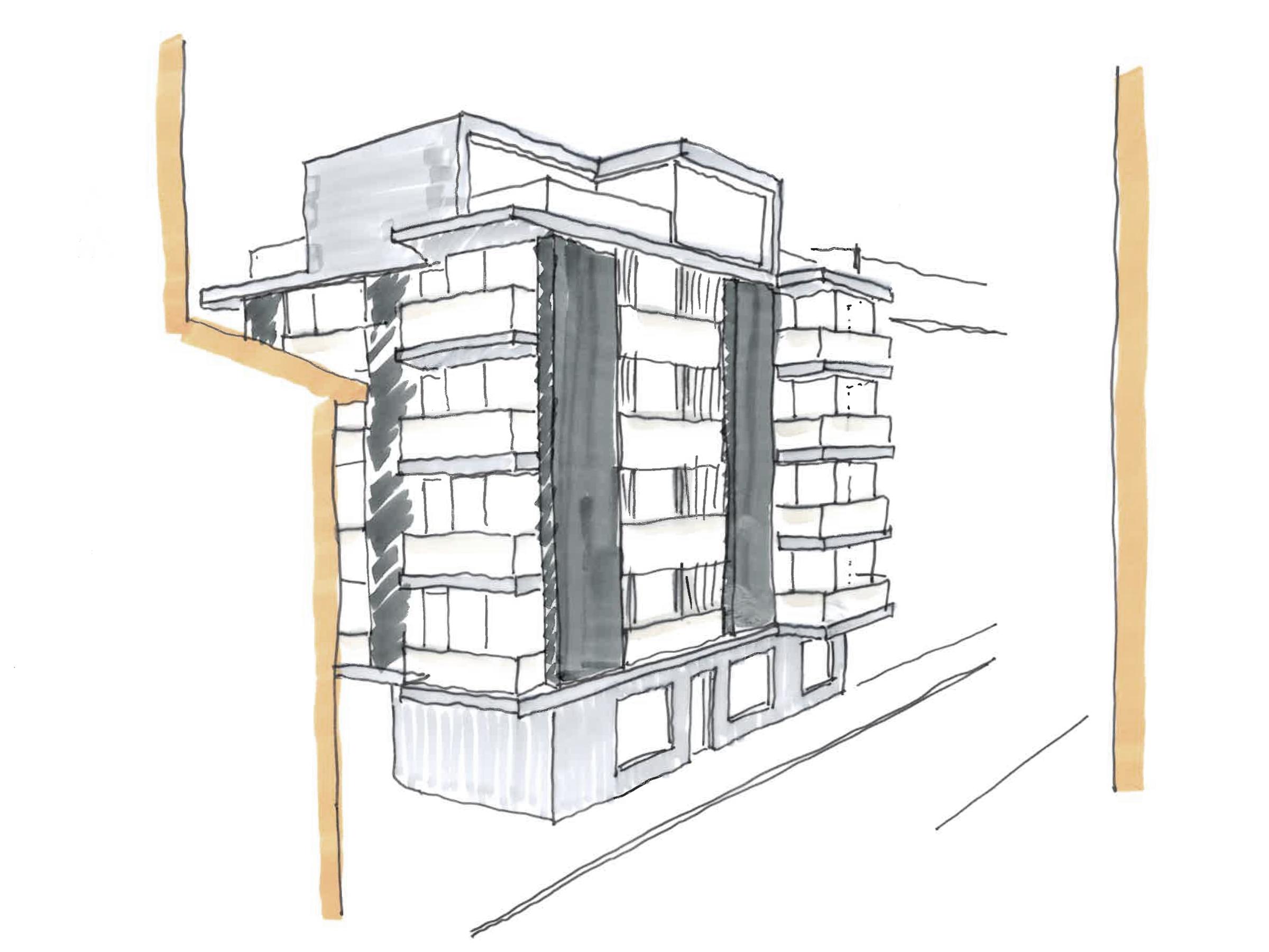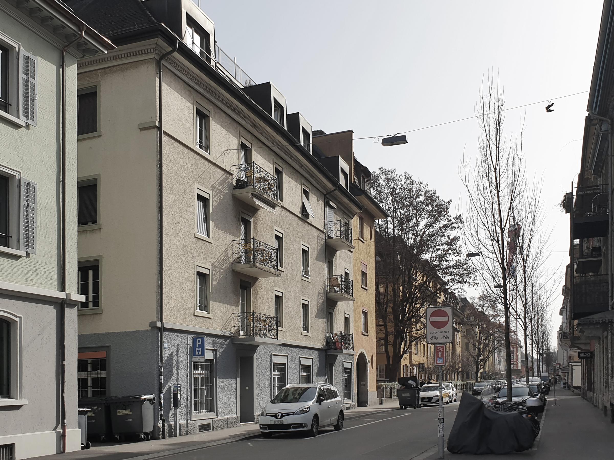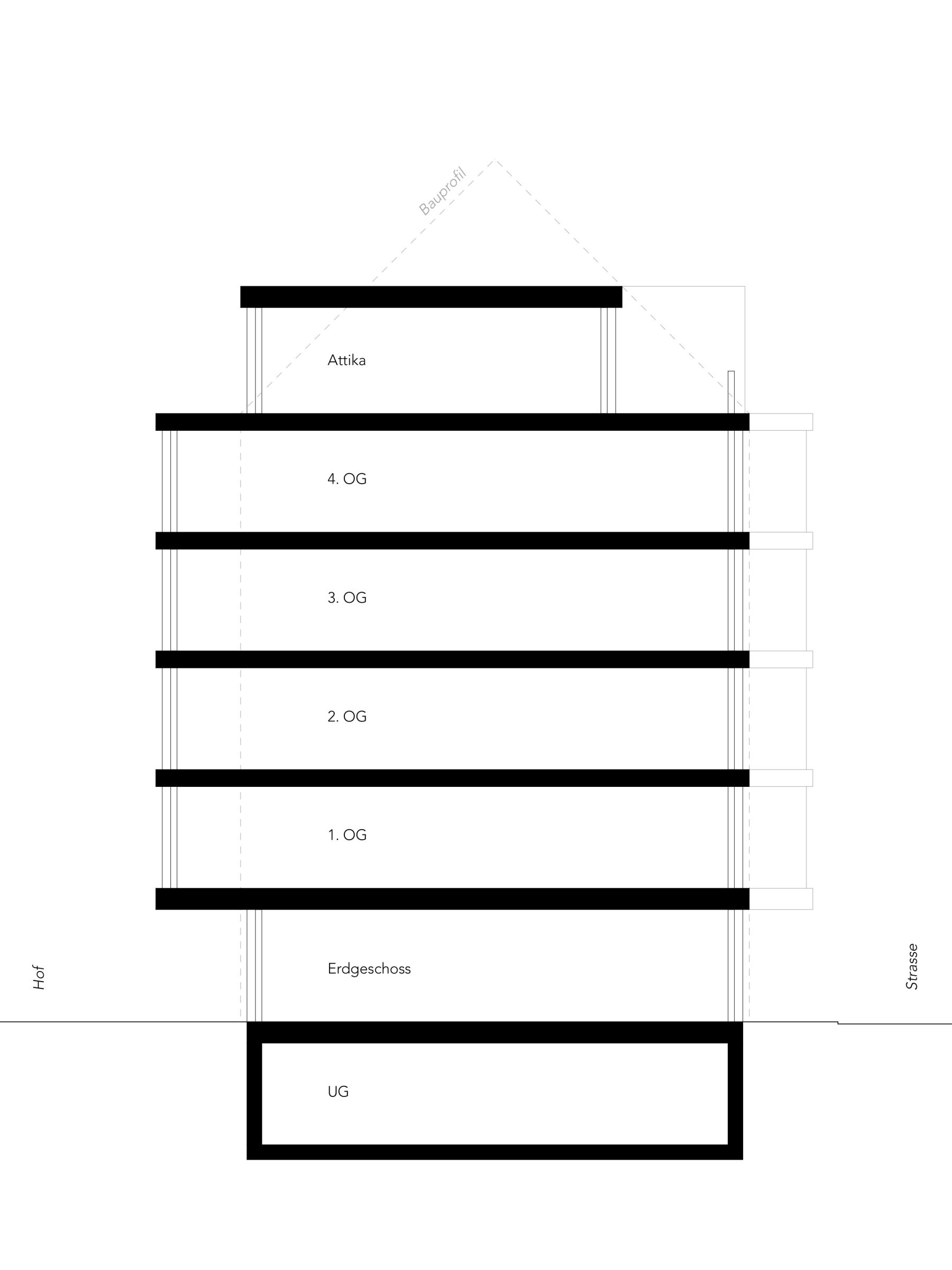 Als Teil einer Blockrandbebauung muss die sanierungsbedürftige Bausubstanz erneuert werden. PEK ARCHITEKTEN wurden damit beauftragt einen Neubau zu projektieren. Das Wohnhaus mit 12 Klein- und einer grosszügigen Attikawohnung beinhaltet ein optisch abgesetztes Sockelgeschoss und sich repetierende, darüberliegende Wohngeschosse. Die Fassade referenziert auf die ortstypische Fassadenerscheinung mit Klinkersteinen, Naturstein, Glasbaustein und adaptiert diese Optik in einem neuen Gewand. Im Erdgeschoss werden Gewerberäumlichkeiten eingeplant.