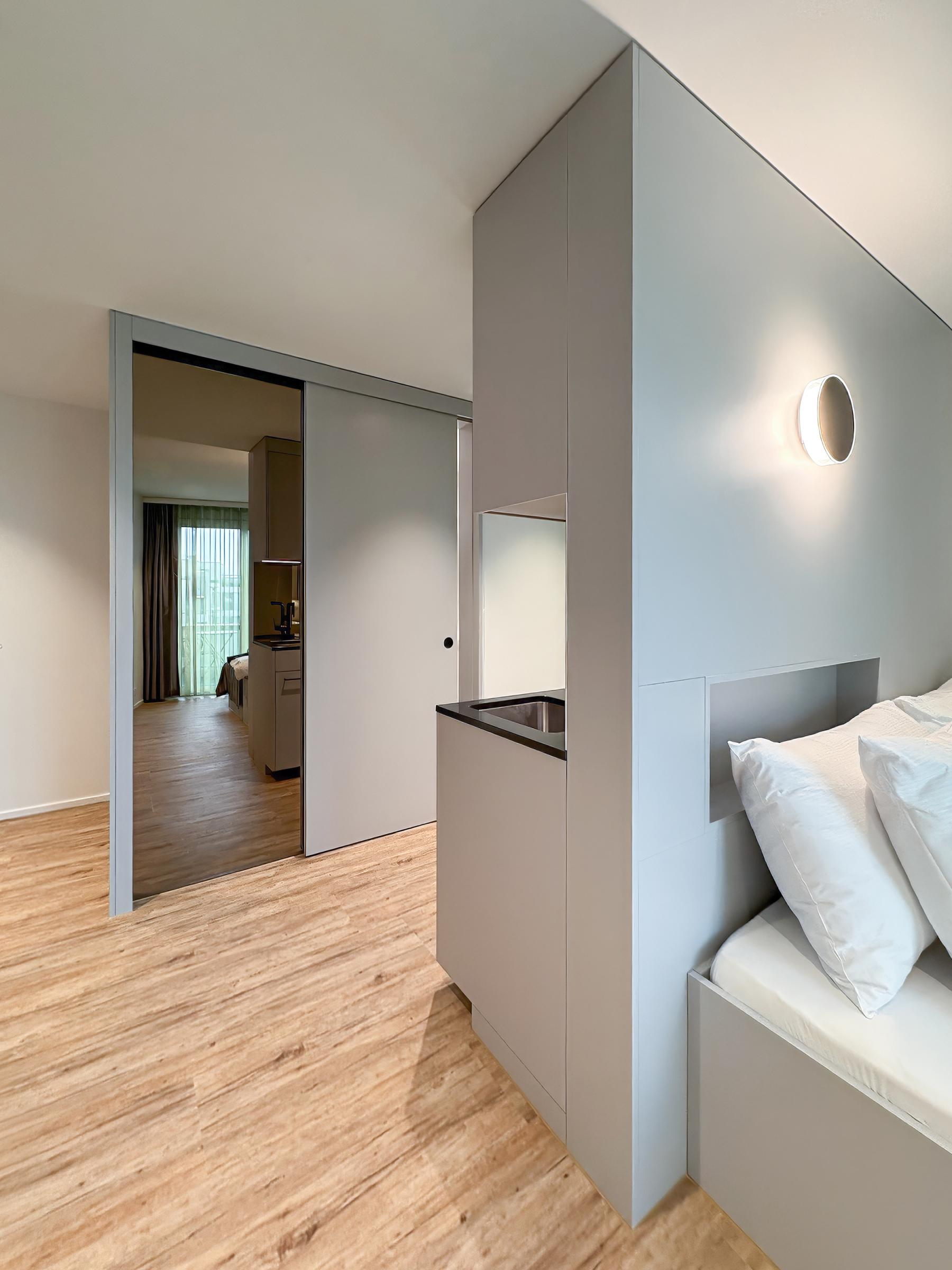 Im Erdgeschoss finden – wie bisher – eine grosse und eine kleine Bar ihren Platz, die den Hotelbetrieb in den oberen Geschossen ergänzen. Die notwendigen Nebenräume sind zusammen mit den haustechnischen Installationen im Untergeschoss untergebracht. In den Regelgeschossen vom 1. bis 5. Obergeschoss befinden sich jeweils fünf Hotelzimmer mit kleiner Küche und Nasszelle. Im neuen Dachgeschoss entstehen drei grosszügige, voll ausgestattete Hotelzimmer.