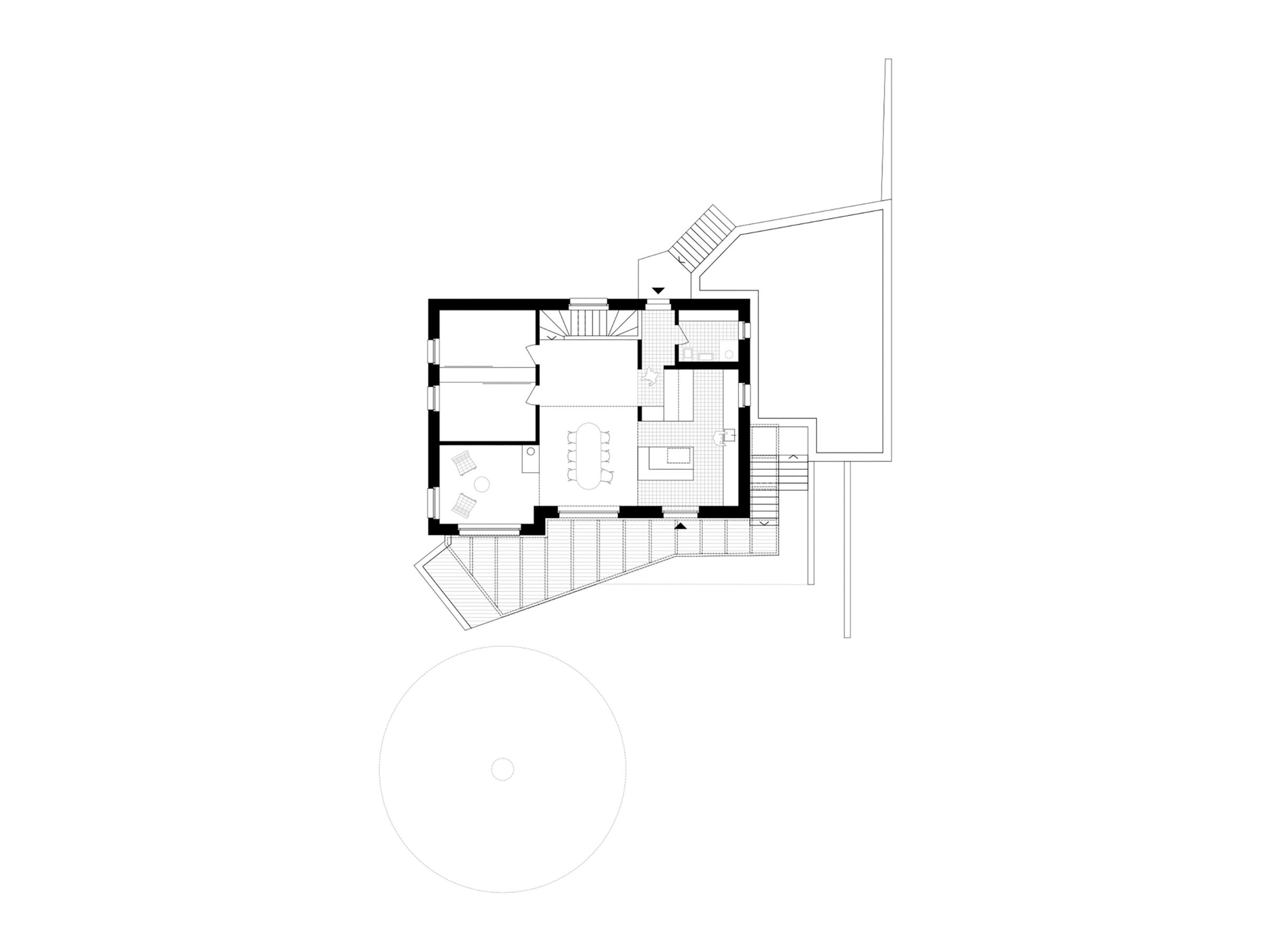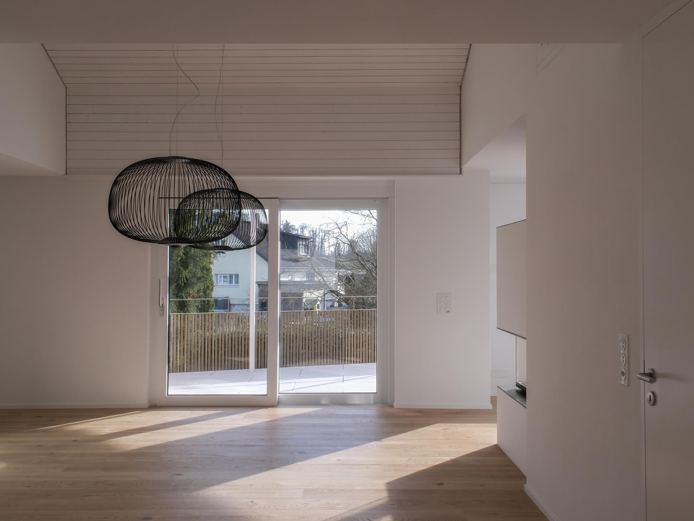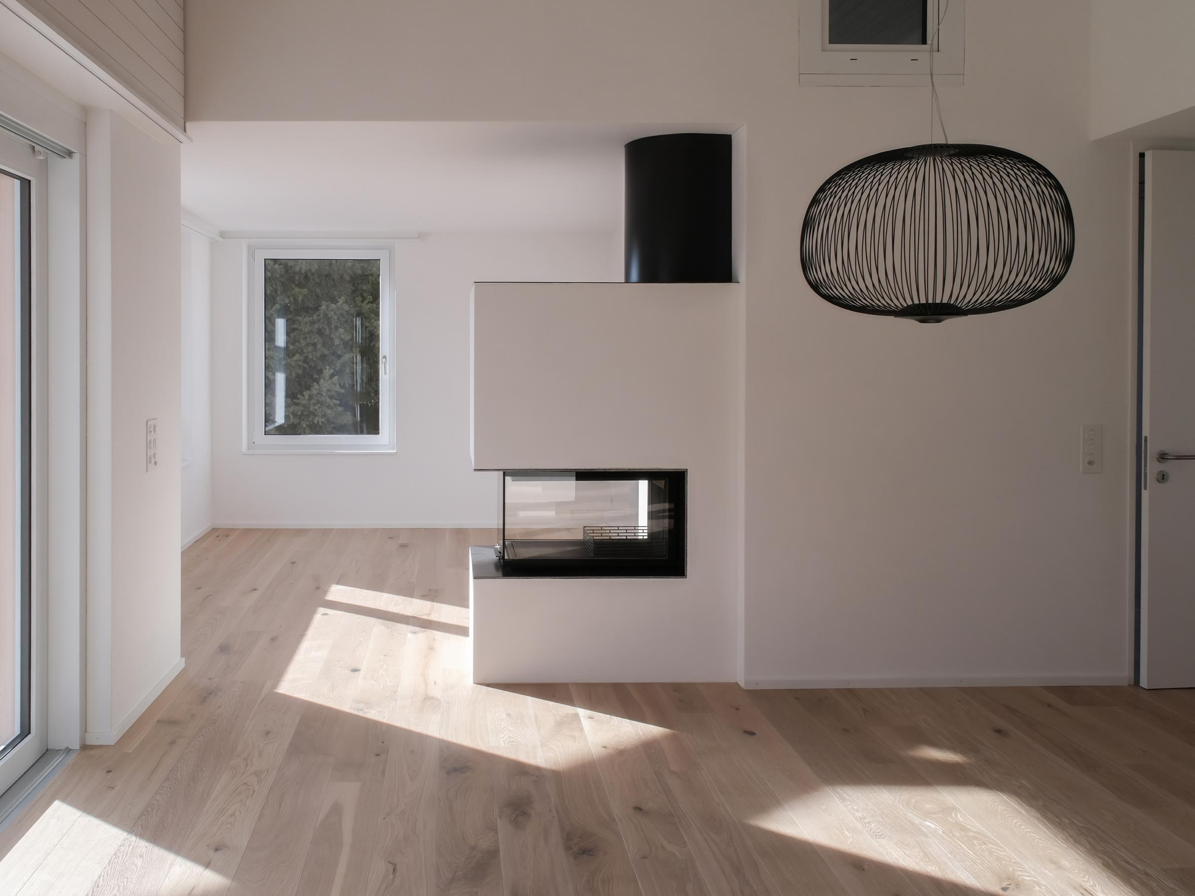 Der Ausbau bietet Komfort, lädt im grossen Essbereich zum Zusammensein ein und gibt dem Haus ein neues Leben. Abgewandt von der Strassenseite öffnet sich das Haus im Süden und lässt Licht in die Wohnräume. Die Südseite ermöglicht zudem einen direkten Zugang zum Garten und zur Terrasse, wodurch das Innen- und Aussenleben miteinander verbunden wird.