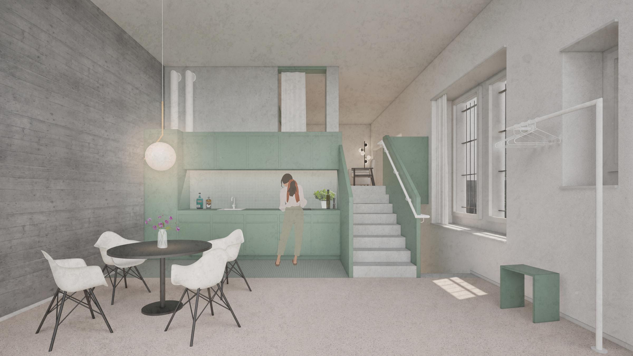Nun soll das Haus im attraktiven Quartier umgenutzt werden. Innerhalb der bestehenden Bausubstanz entstehen zwei Stadtwohnungen, ohne dass der charakteristische Charme des Gebäudes verloren geht. Auf den bestehenden zwei Geschossen mit einem überhohen Erdgeschoss werden drei neue Geschosse in Split-Level-Bauweise errichtet. Grosszügige Lichtschächte bringen viel Tageslicht in die ehemaligen Werkräume im Untergeschoss. Zudem entsteht auf dem Dach ein attraktiver Aussenraum mit Stadtgarten, der über einen gemeinsamen Aufgang innerhalb der Bausubstanz erschlossen wird.