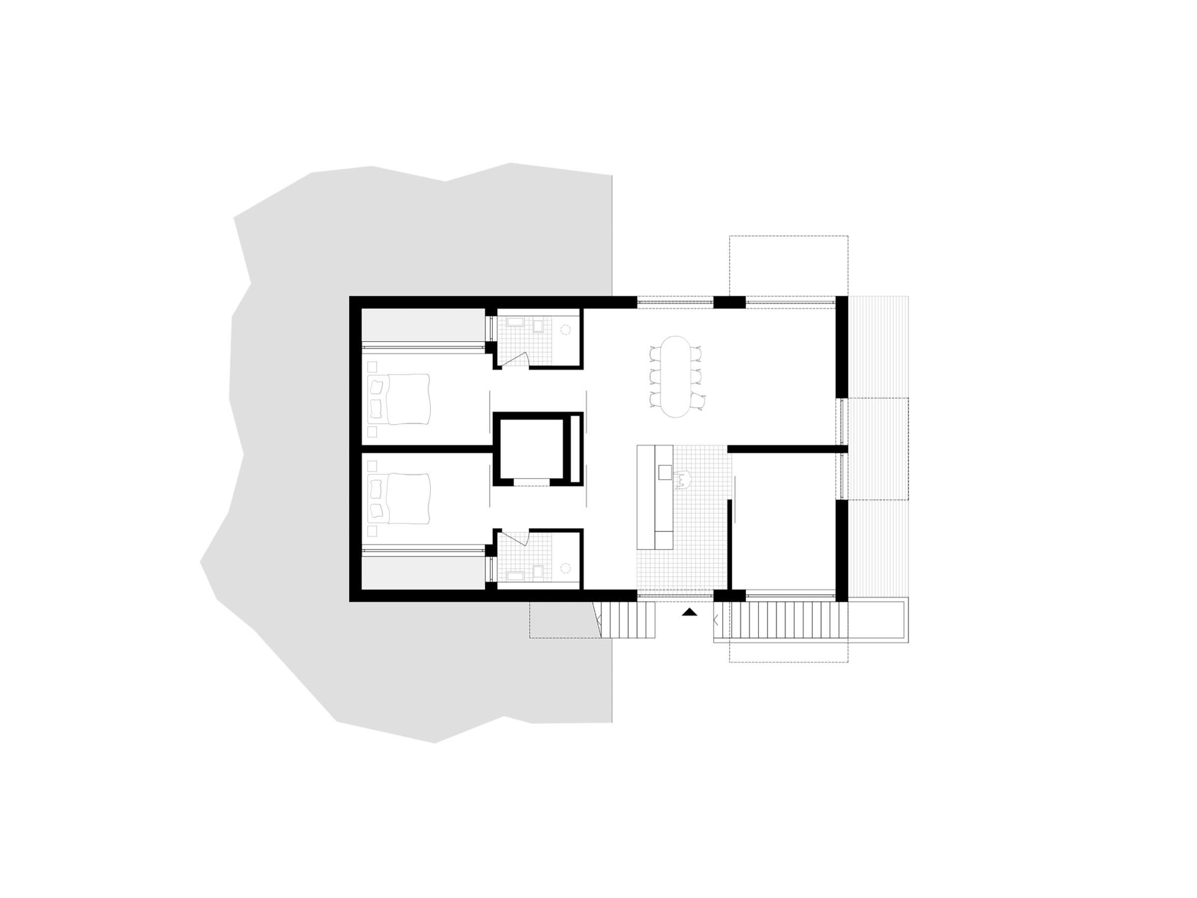 Aufgrund der Topografie erfolgt die Erschliessung des Gebäudes an der südlich ausgerichteten Fassade.