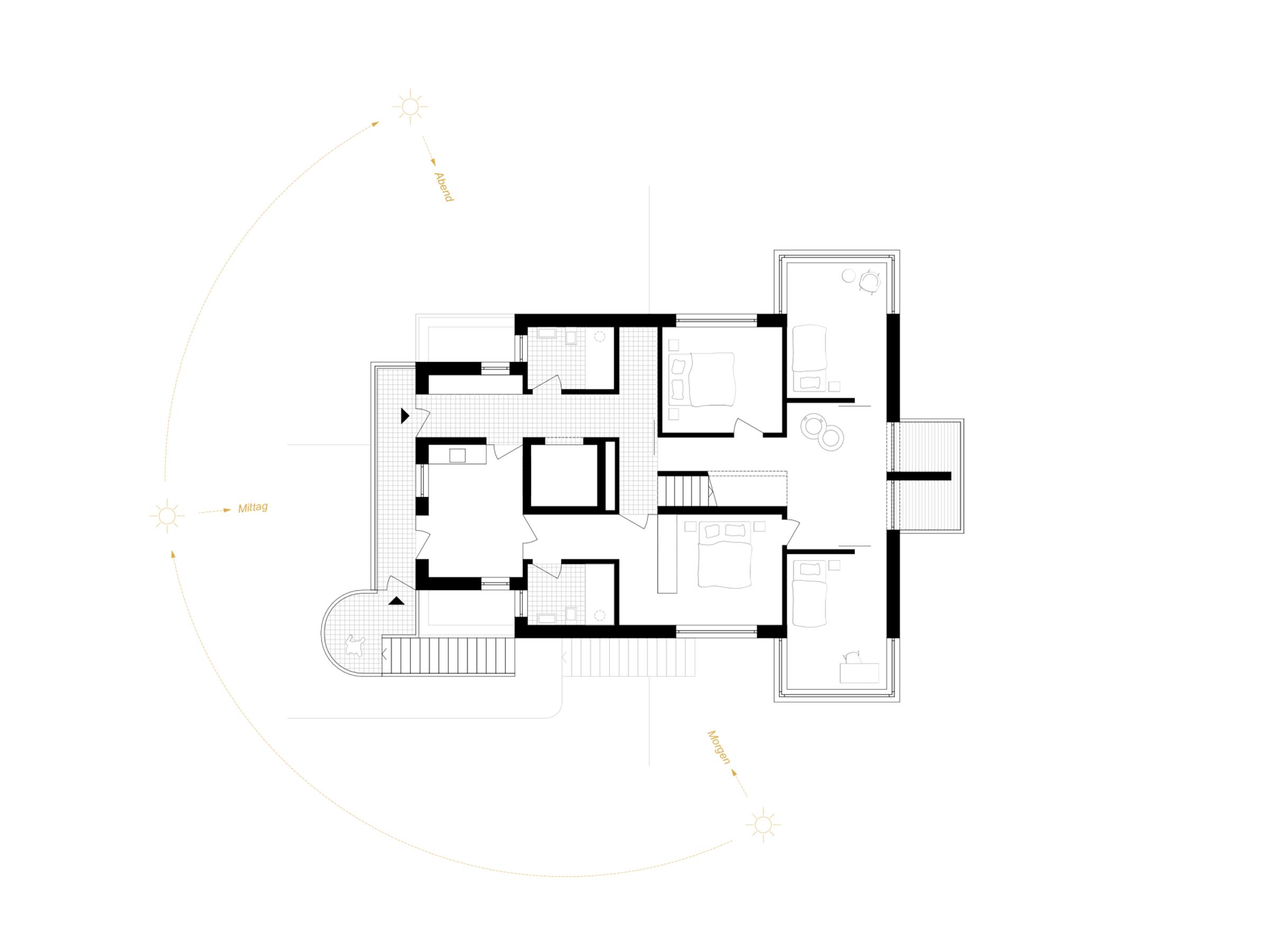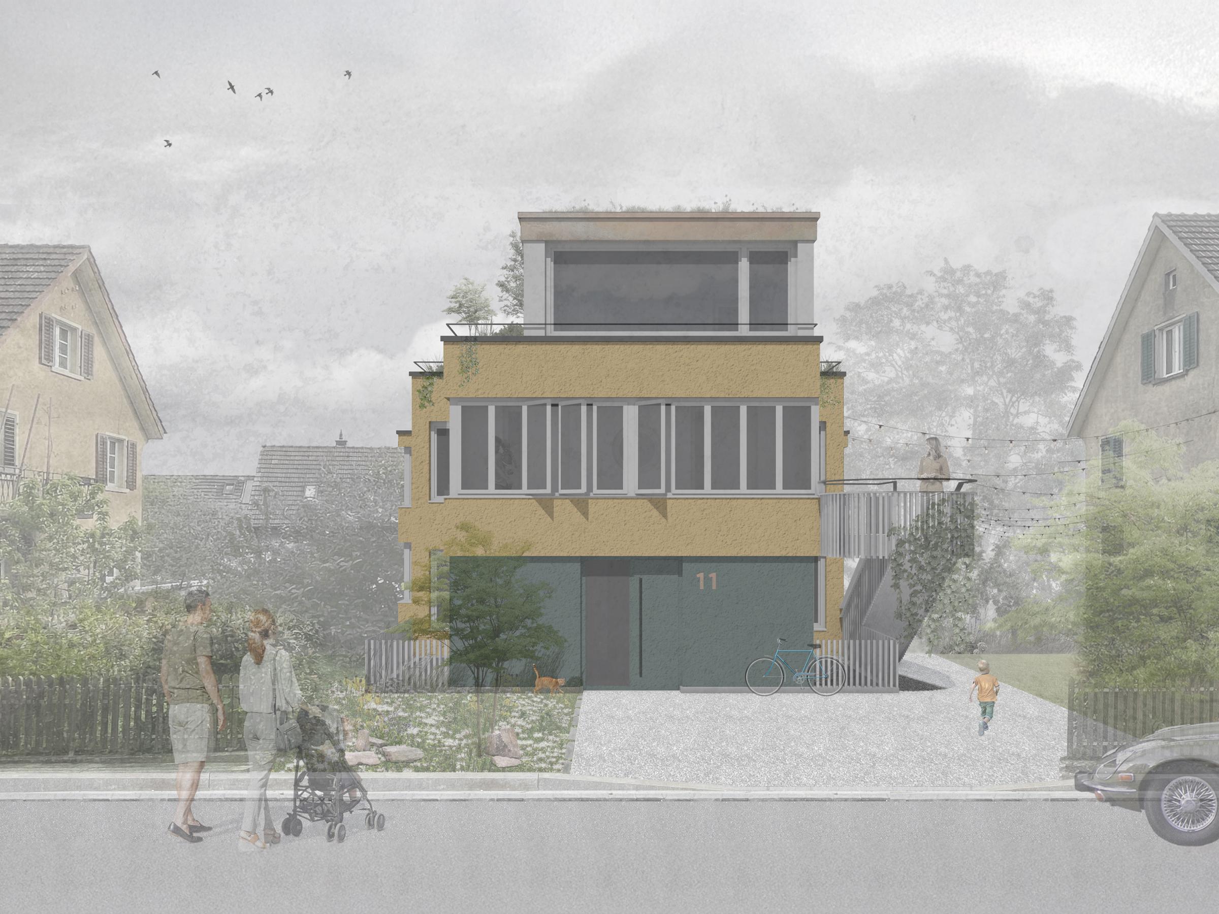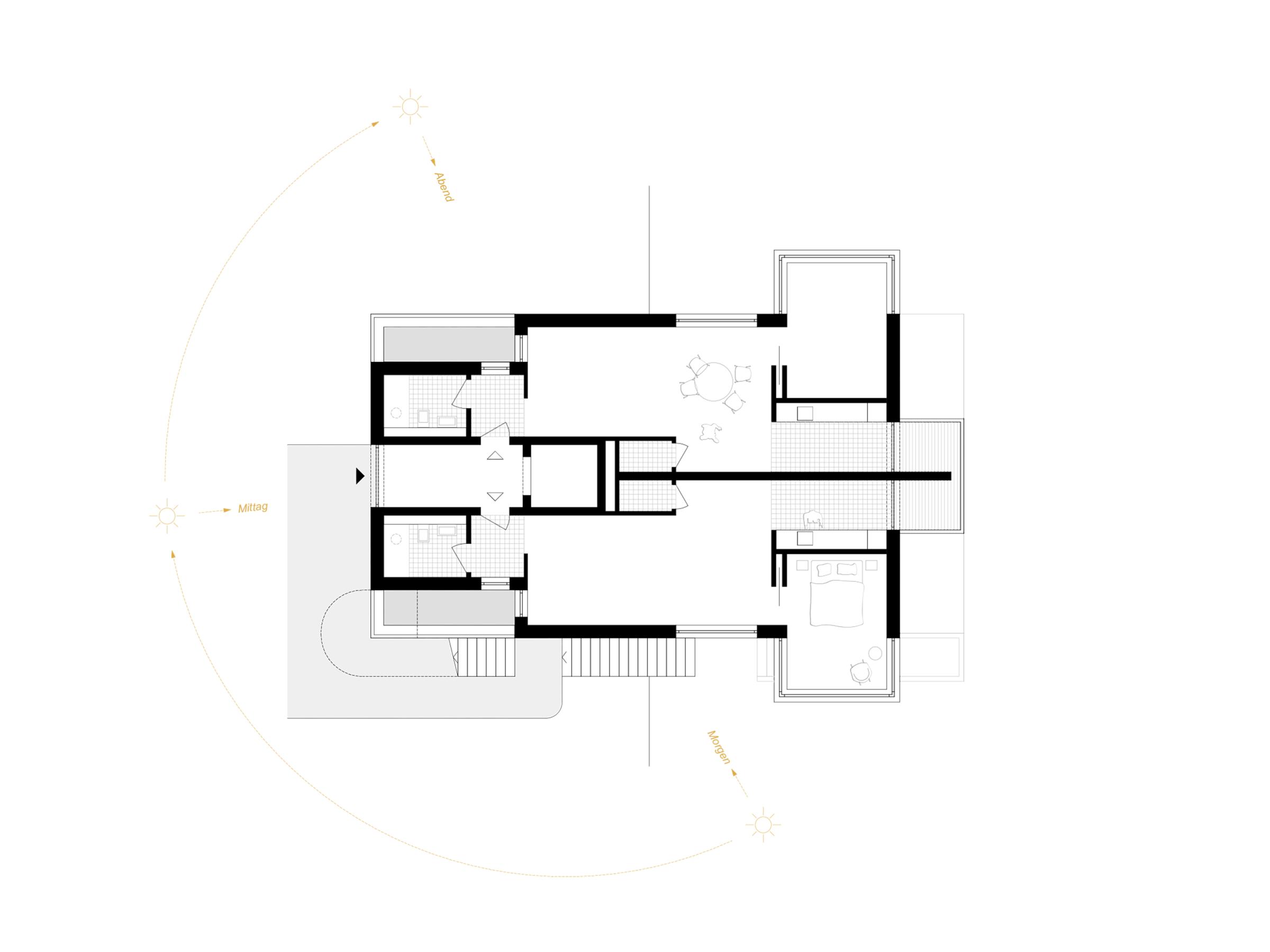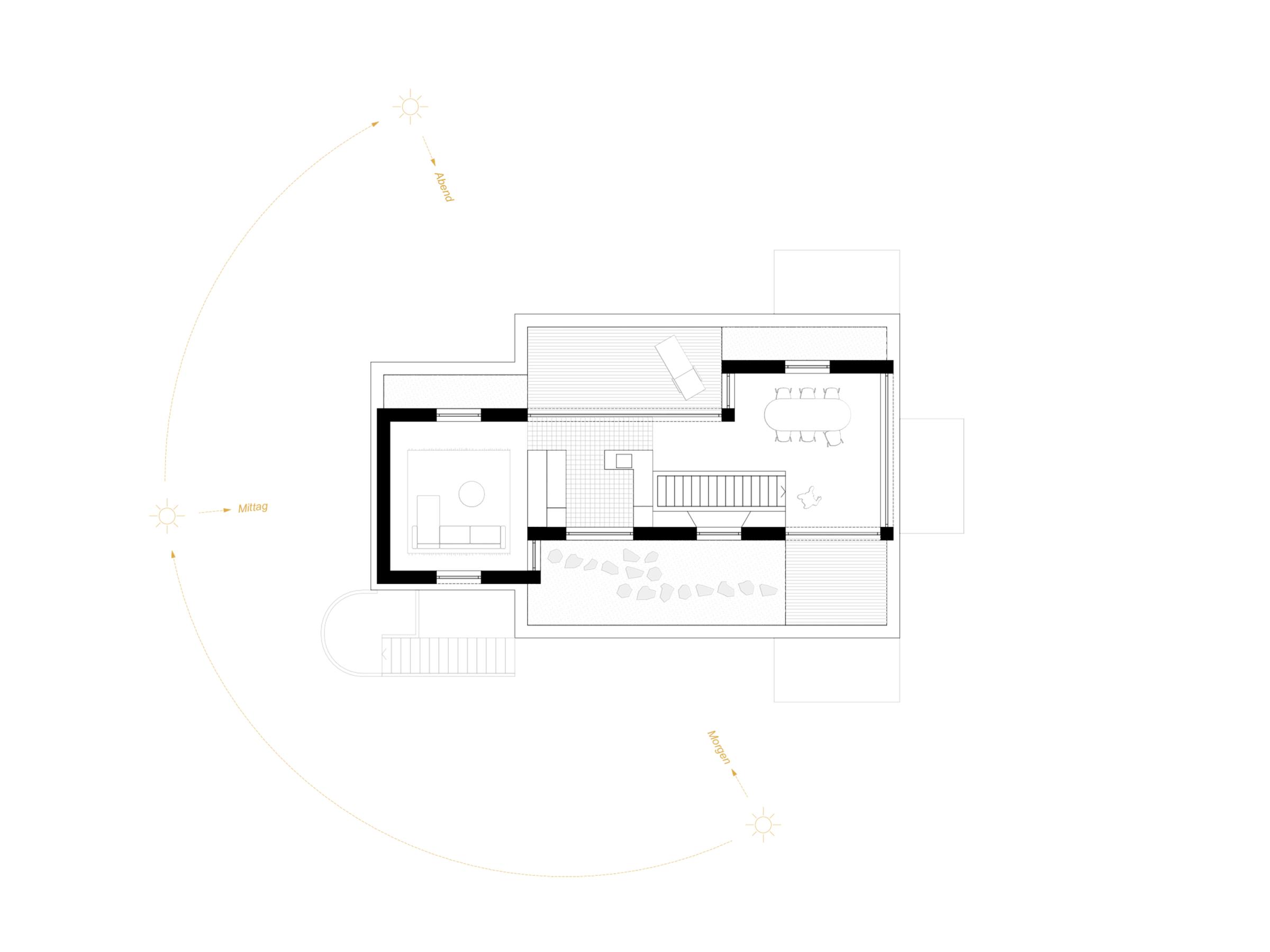 In den beiden unteren Geschossen befinden sich zwei separate Wohnungen. Die oberen beiden Etagen bilden eine grosszügige Familienwohnung für die Bauherrschaft, wobei das Dachgeschoss den Mittelpunkt des Wohnens darstellt und direkten Zugang zur begrünten Dachterrasse bietet.