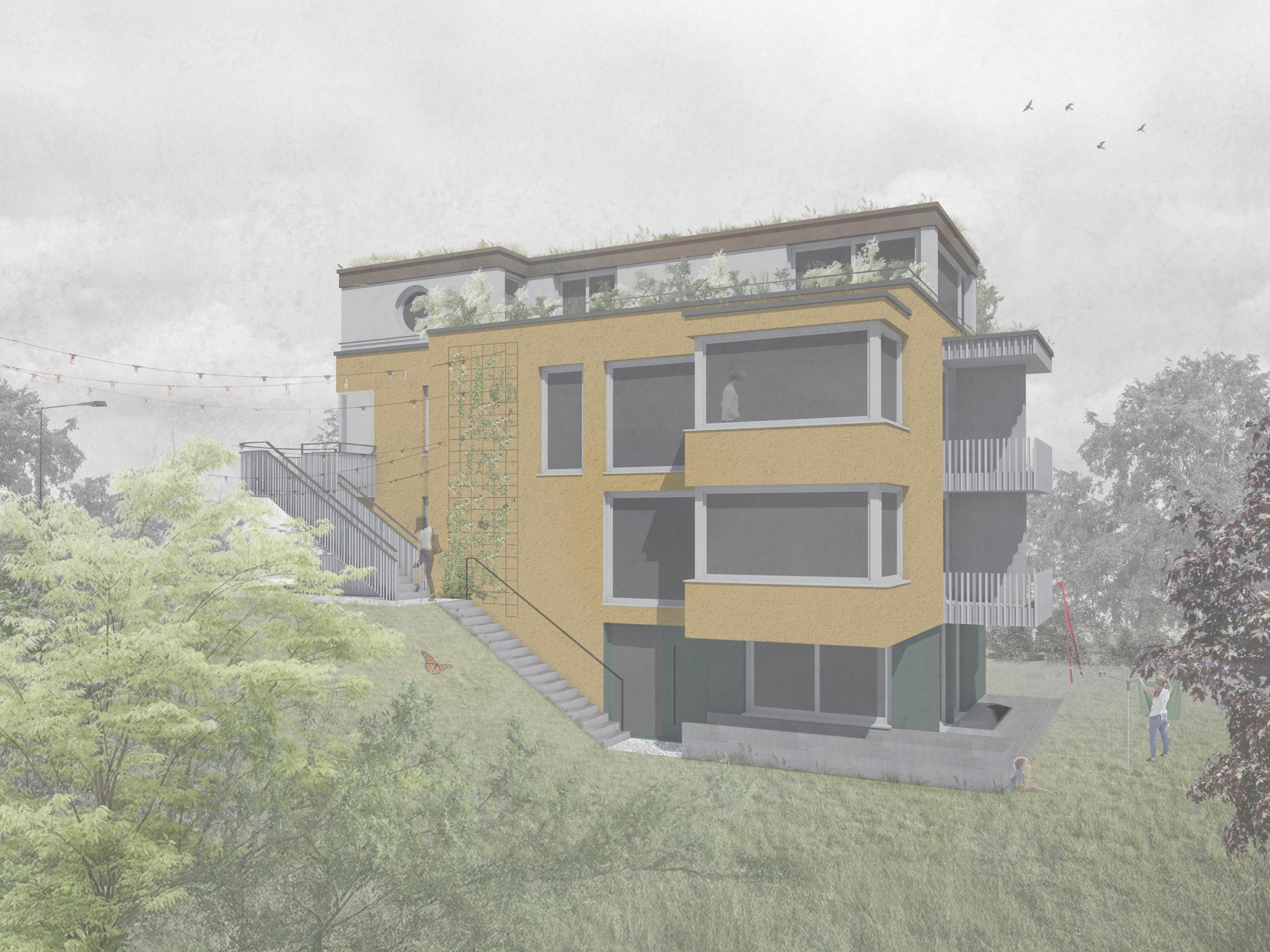 Das Gebäude erstreckt sich über vier Ebenen und vereint städtisches Wohnen mit einem hohen Anspruch an Wohnqualität und Nachhaltigkeit. Die klare Gliederung der Grundrisse erlaubt flexible Nutzungsmöglichkeiten für Familien, Paare oder gemeinschaftliches Wohnen.