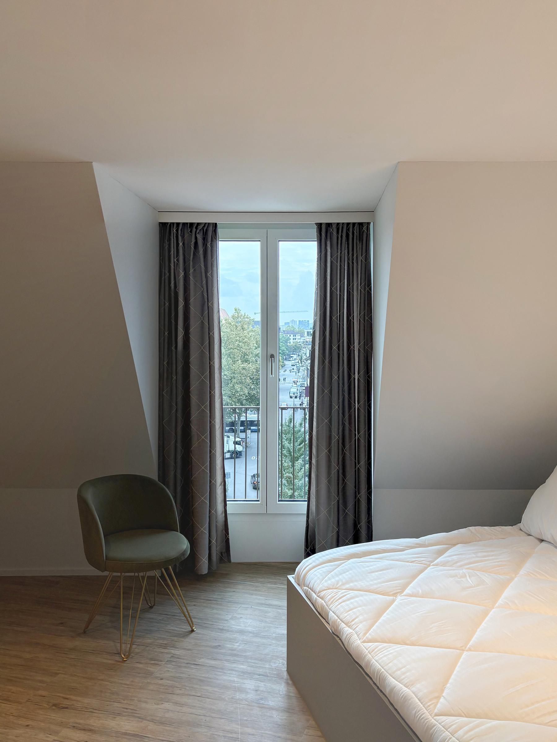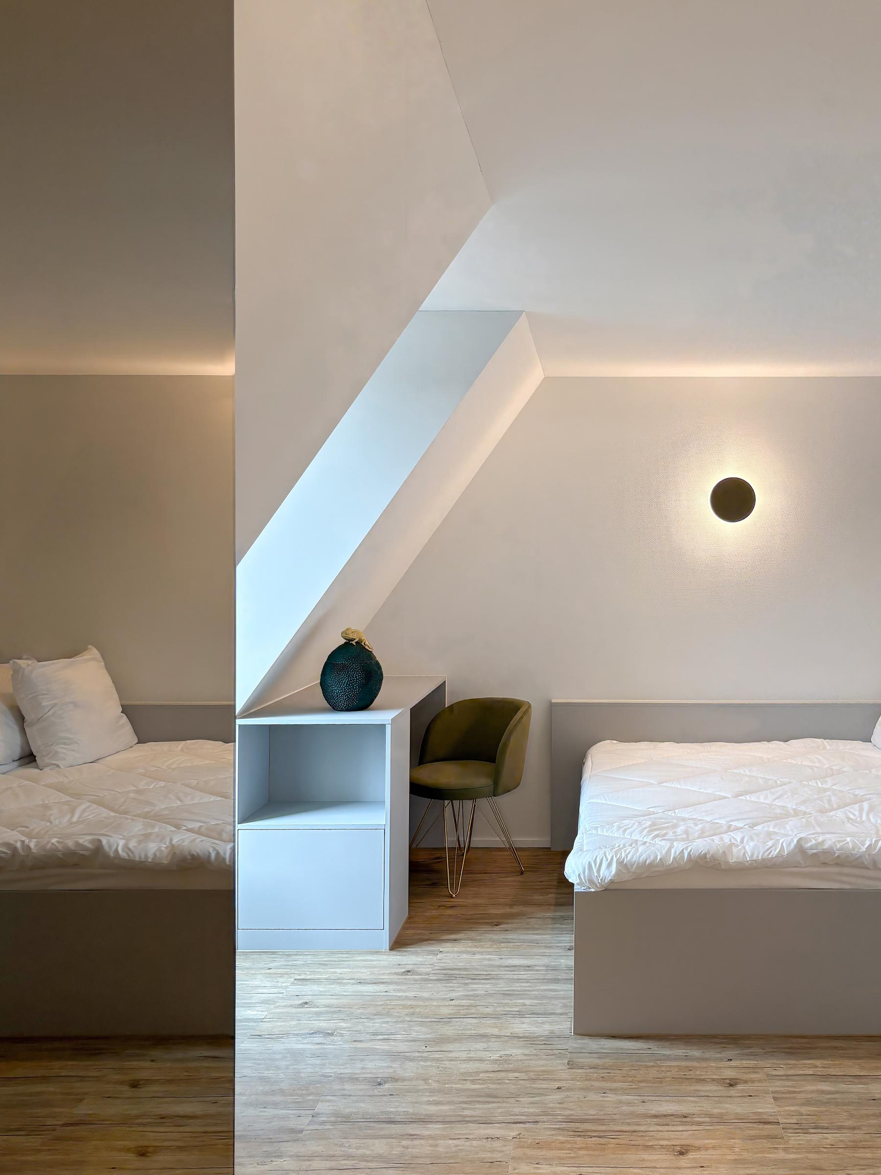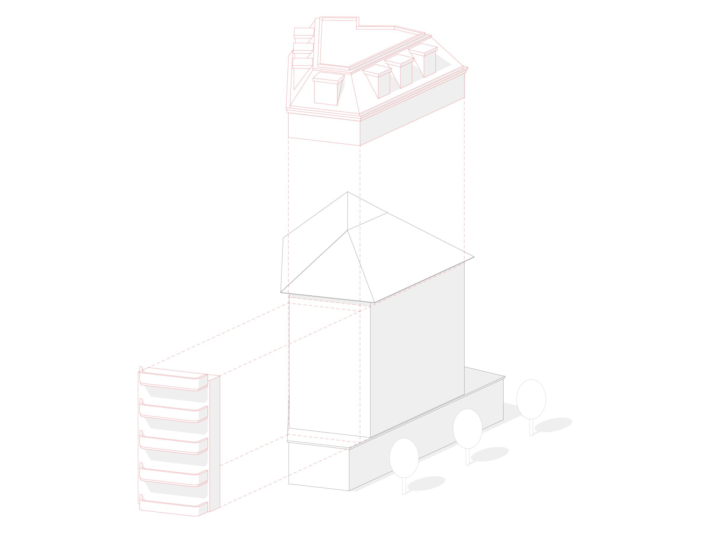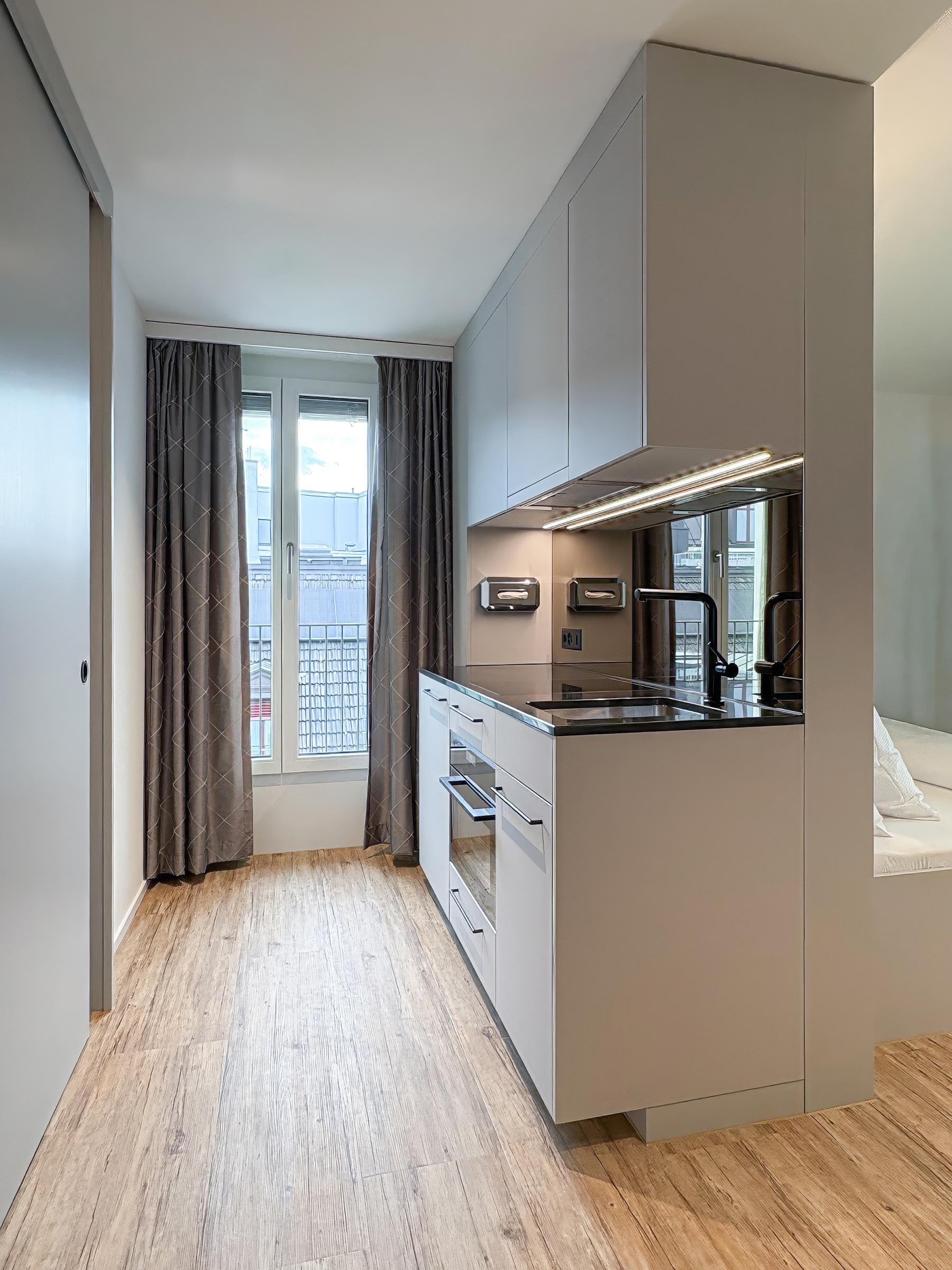 Im Erdgeschoss finden – wie bisher – eine grosse und eine kleine Bar ihren Platz, die den Hotelbetrieb in den oberen Geschossen ergänzen. Die notwendigen Nebenräume sind zusammen mit den haustechnischen Installationen im Untergeschoss untergebracht. In den Regelgeschossen vom 1. bis 5. Obergeschoss befinden sich jeweils fünf Hotelzimmer mit kleiner Küche und Nasszelle. Im neuen Dachgeschoss entstehen drei grosszügige, voll ausgestattete Hotelzimmer.