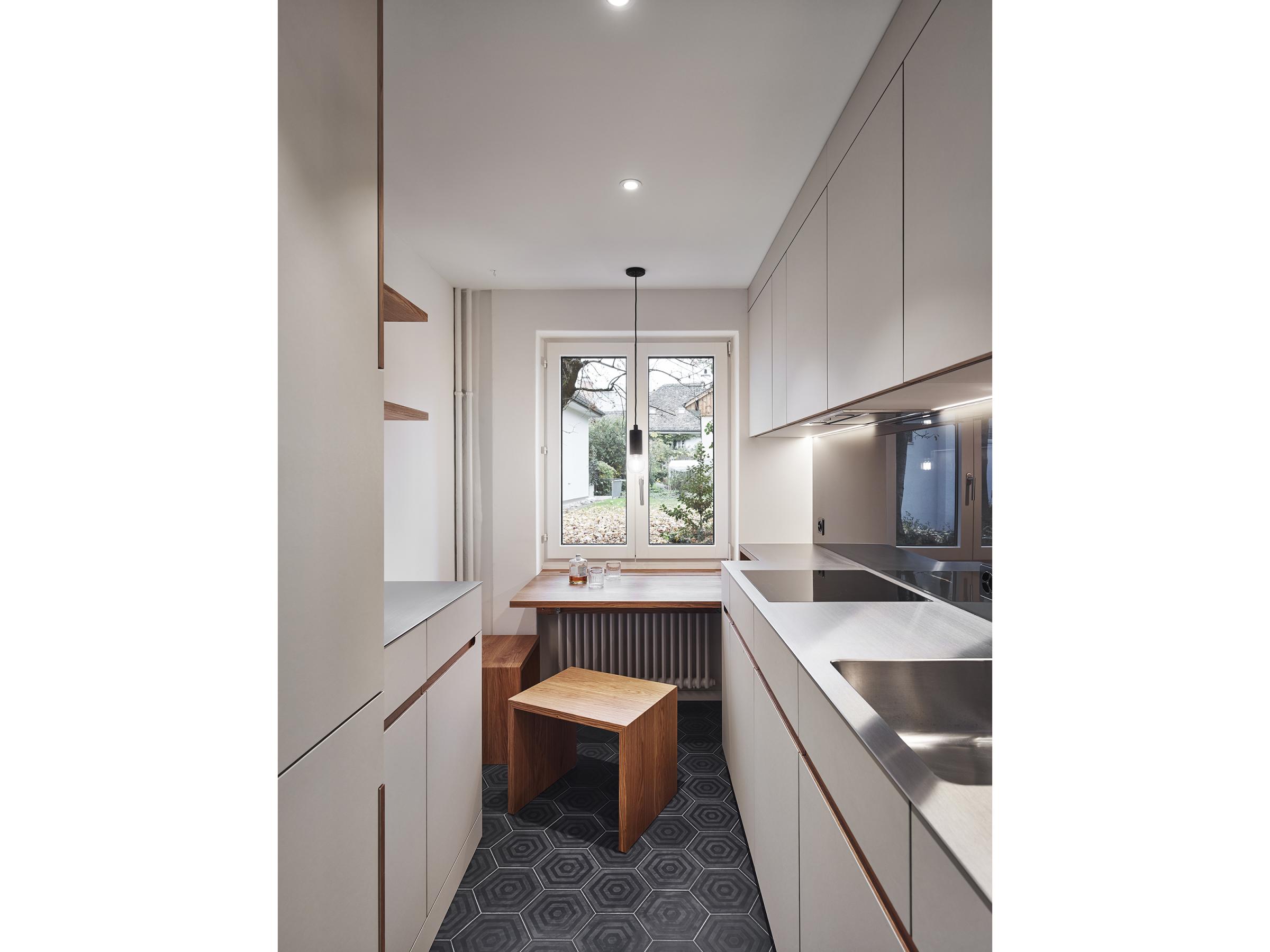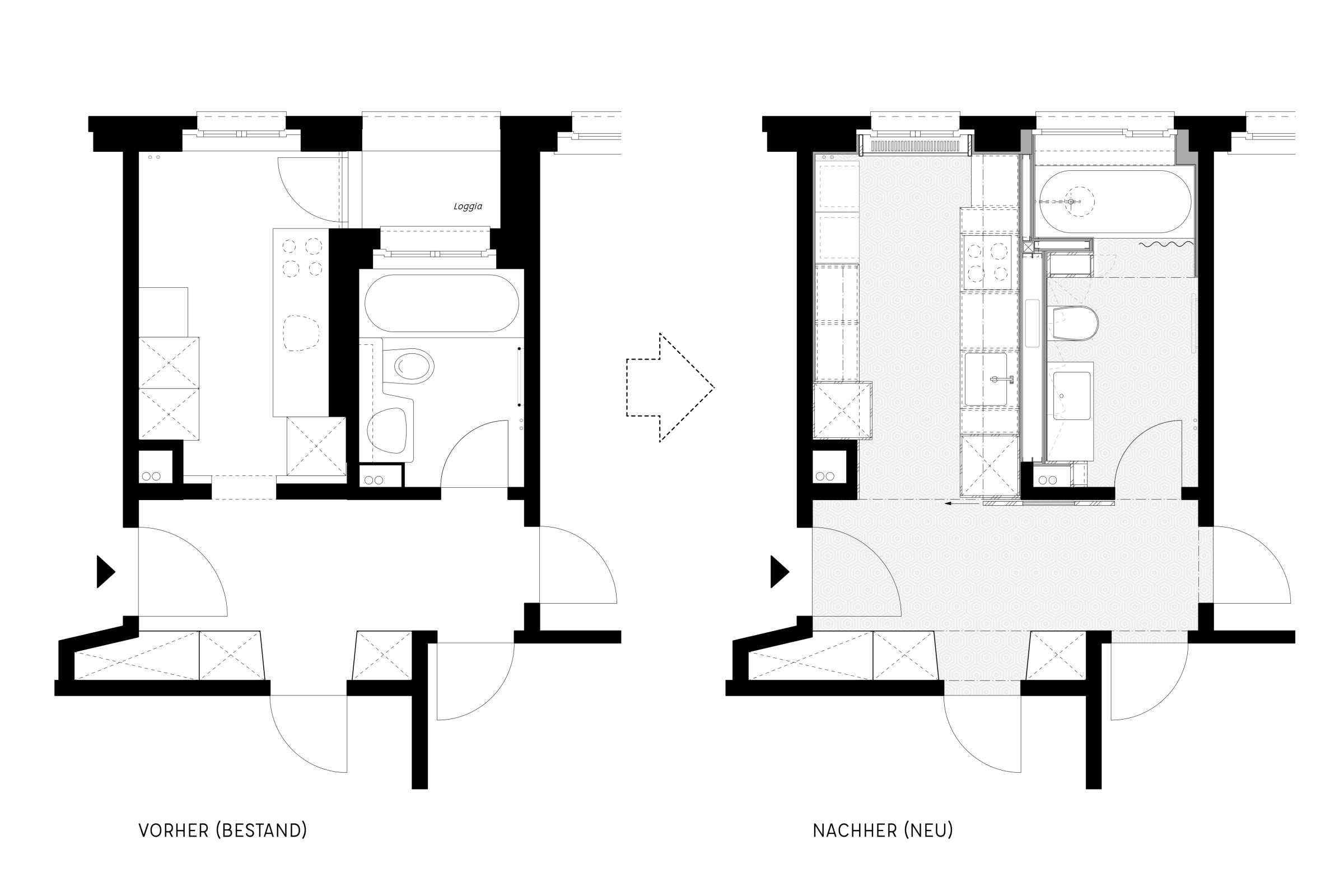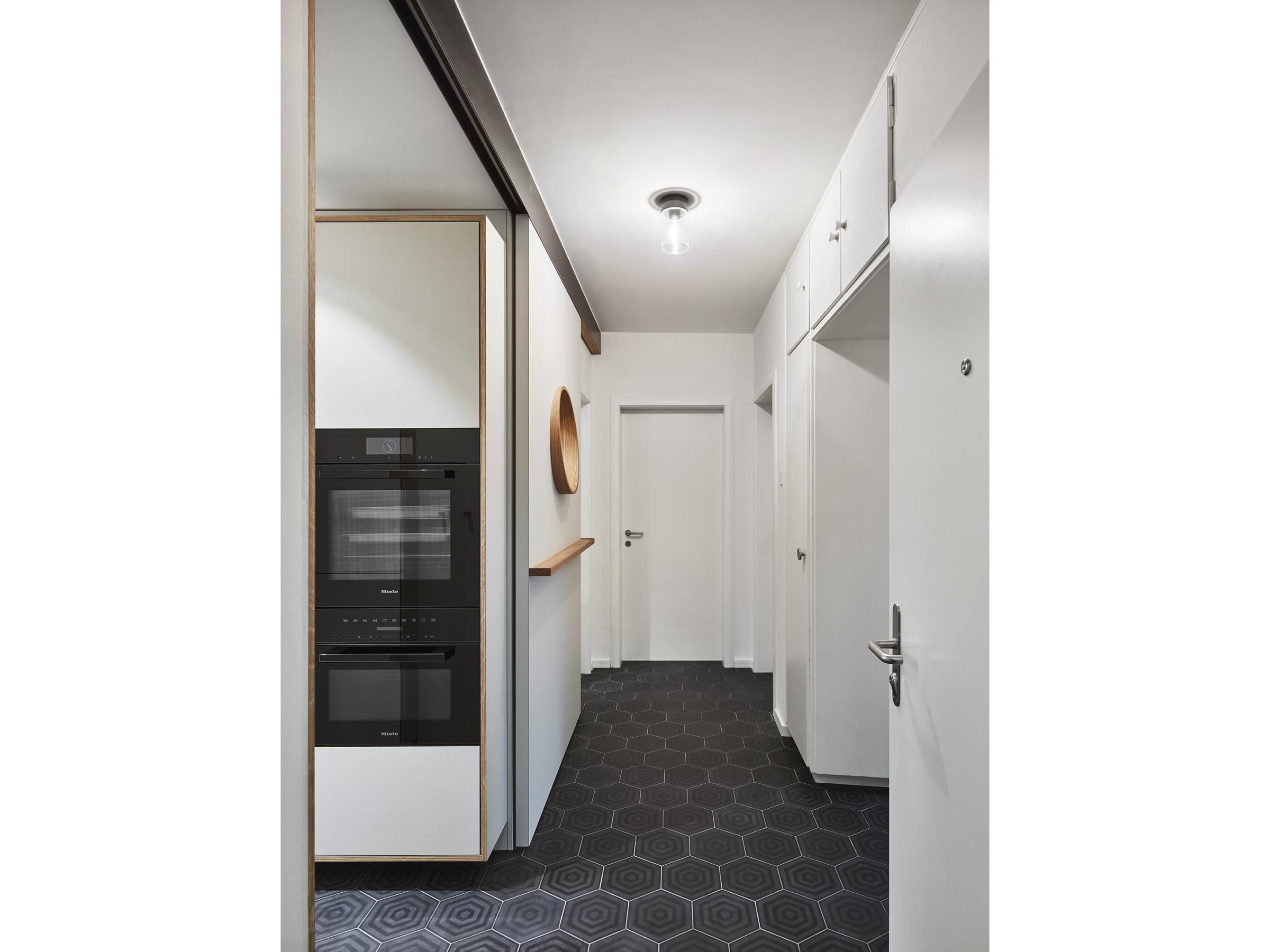 Die Platzverhältnisse und Raumeinteilungen von Küche und Bad aus den 1940er Jahren entsprechen nicht mehr den heutigen Bedürfnissen der Eigentümer. PEK ARCHITEKTEN wurden beauftragt, der Eigentumswohnung neues Leben einzuhauchen. Der Loggia-Aussenraum wird der Wohnung zugeschlagen und das Bad in seiner Fläche vergrössert. Entrée, Küche und Bad werden komplett saniert und überarbeitet. Durchdachte Materialien sollen die neuen Oberflächen zieren und die Räume unkonventionell und spannend halten und dabei den Vintage-Vibe der Wohnung beibehalten. Die kleinen Räume werden mit modifizierbaren und vielseitig nutzbaren Elementen ausgestattet.