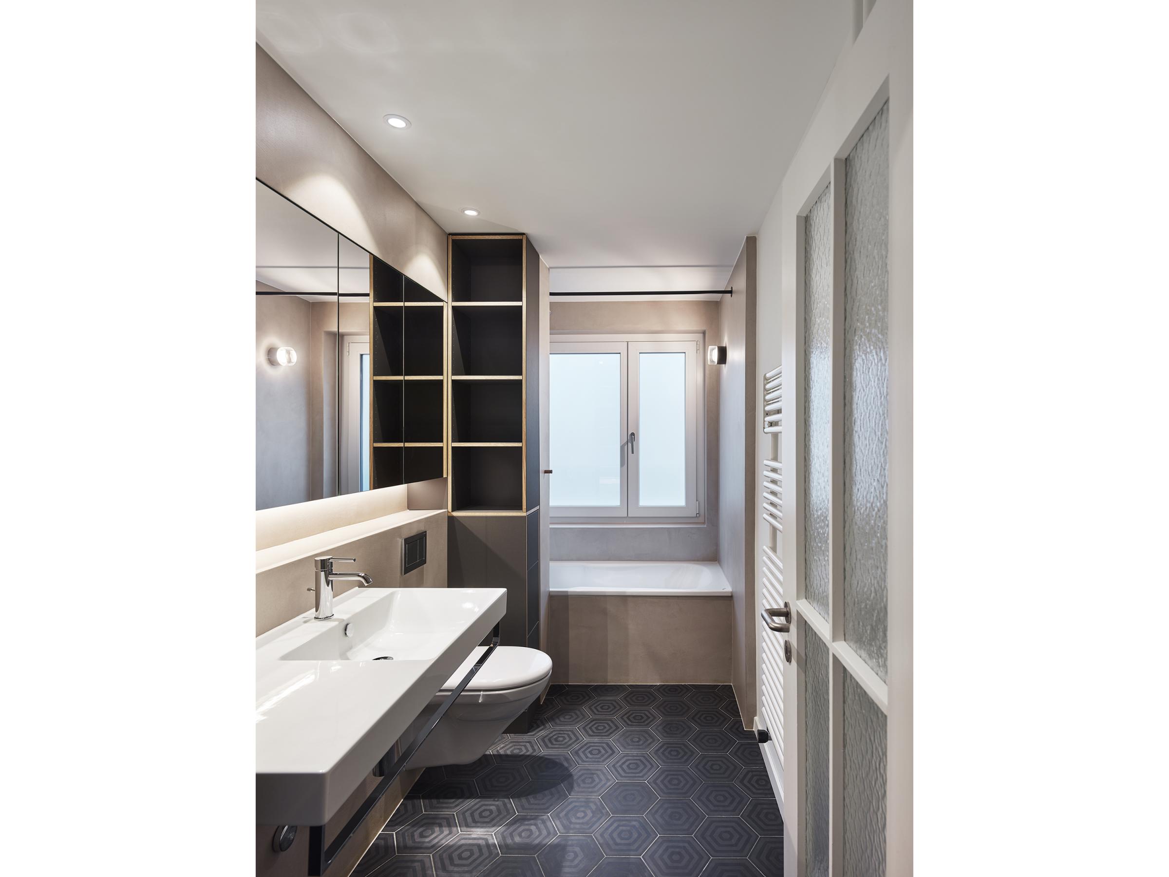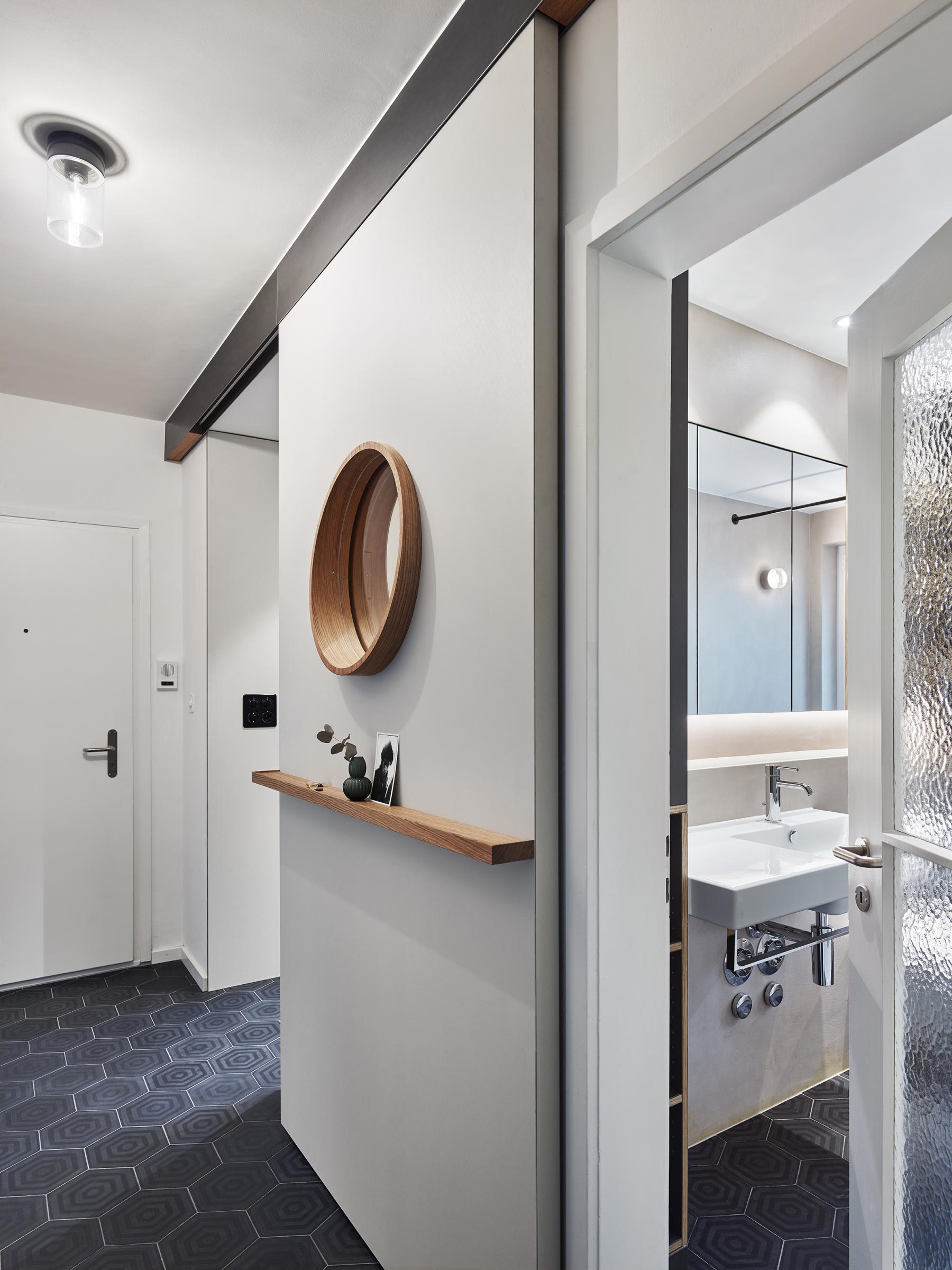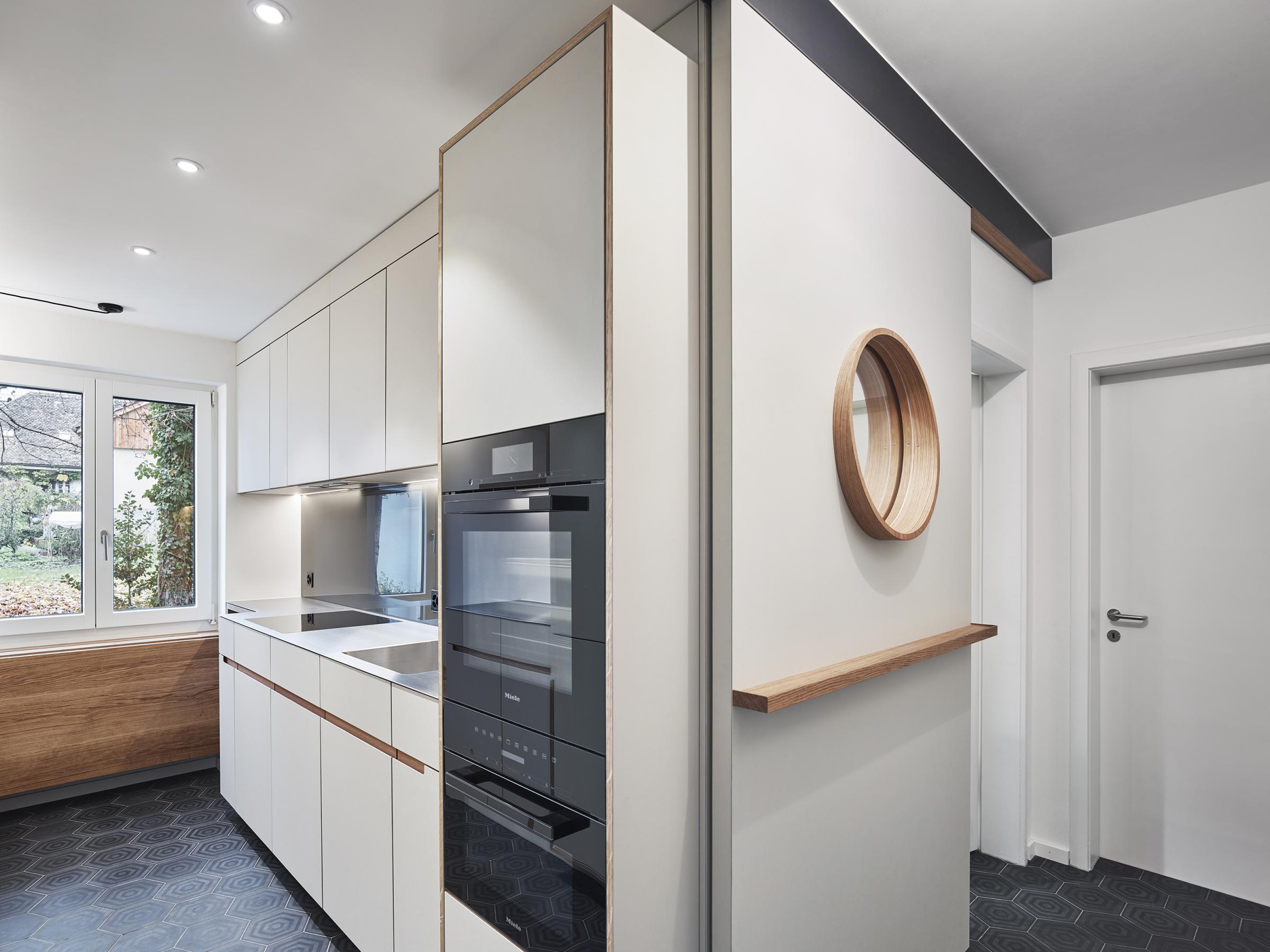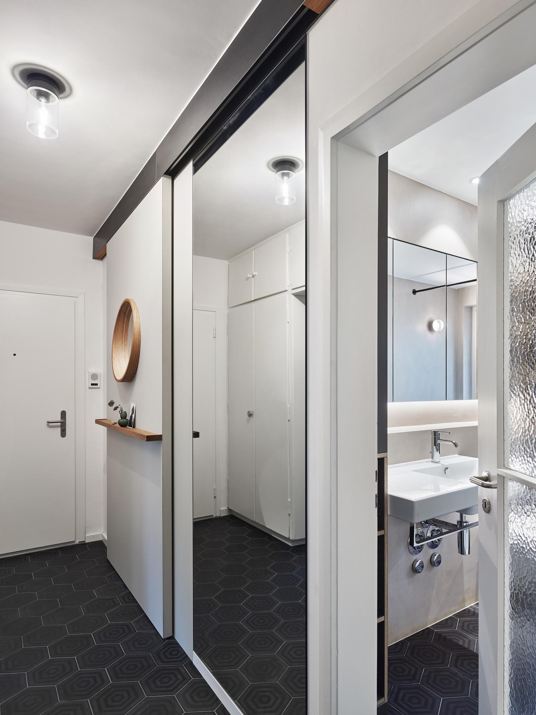 Die Platzverhältnisse und Raumeinteilungen von Küche und Bad aus den 1940er Jahren entsprechen nicht mehr den heutigen Bedürfnissen der Eigentümer. PEK ARCHITEKTEN wurden beauftragt, der Eigentumswohnung neues Leben einzuhauchen. Der Loggia-Aussenraum wird der Wohnung zugeschlagen und das Bad in seiner Fläche vergrössert. Entrée, Küche und Bad werden komplett saniert und überarbeitet. Durchdachte Materialien sollen die neuen Oberflächen zieren und die Räume unkonventionell und spannend halten und dabei den Vintage-Vibe der Wohnung beibehalten. Die kleinen Räume werden mit modifizierbaren und vielseitig nutzbaren Elementen ausgestattet.