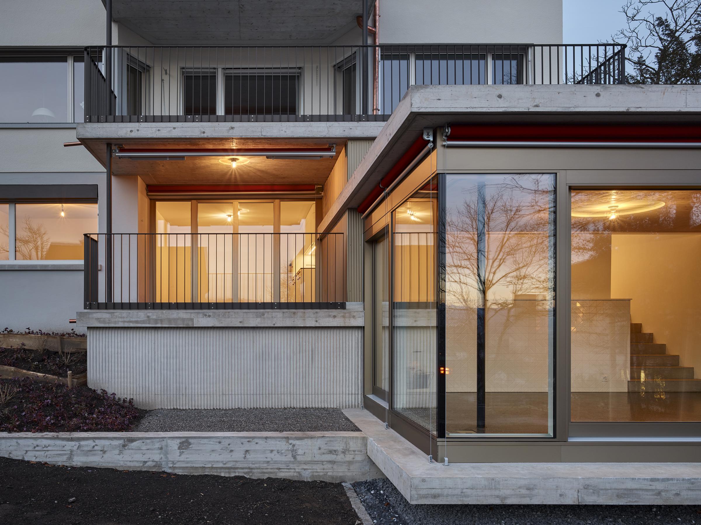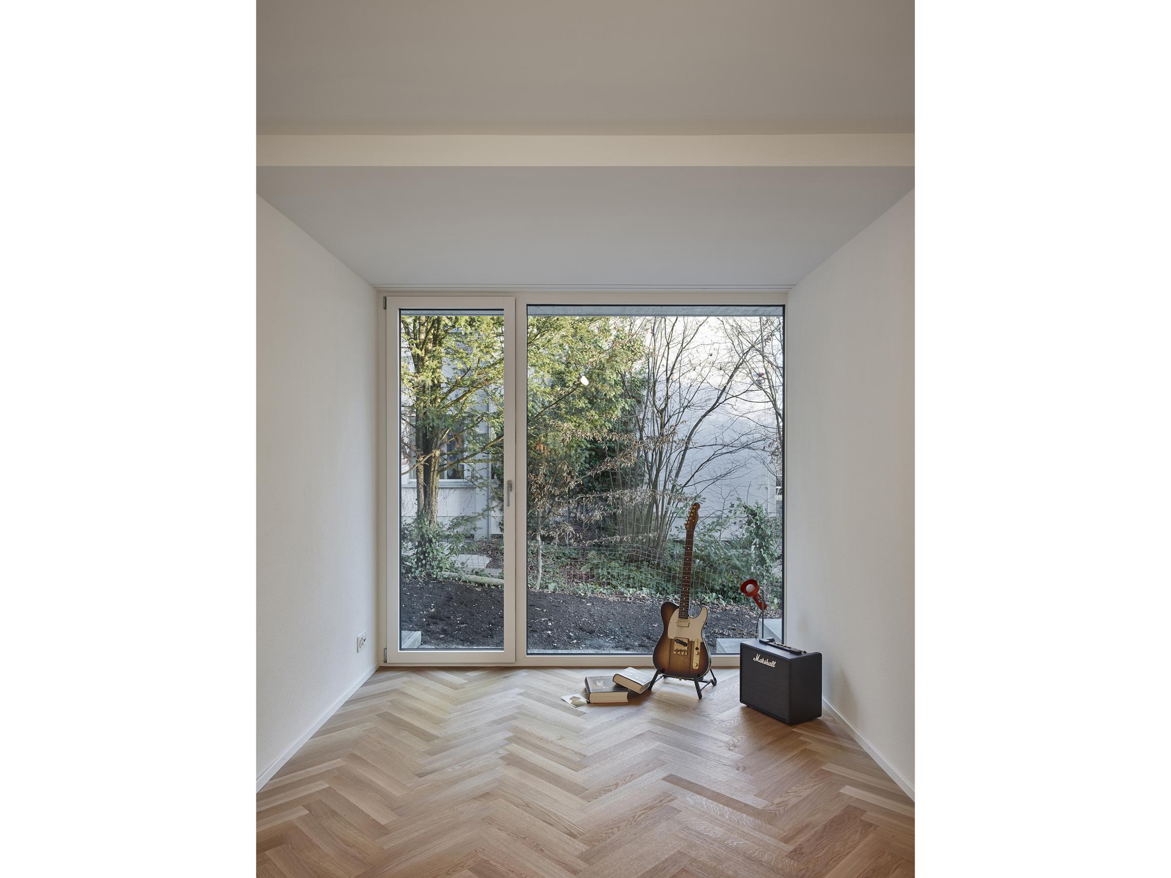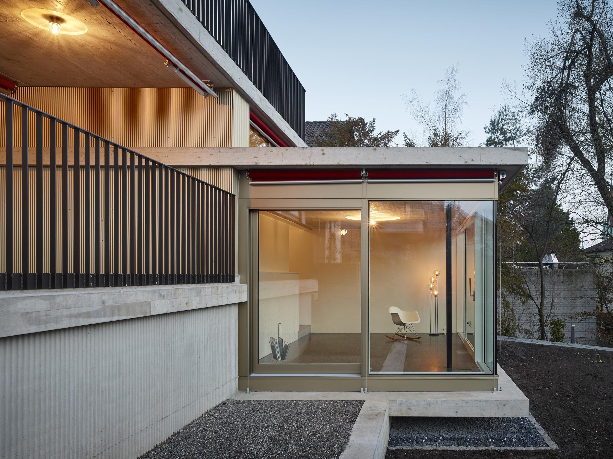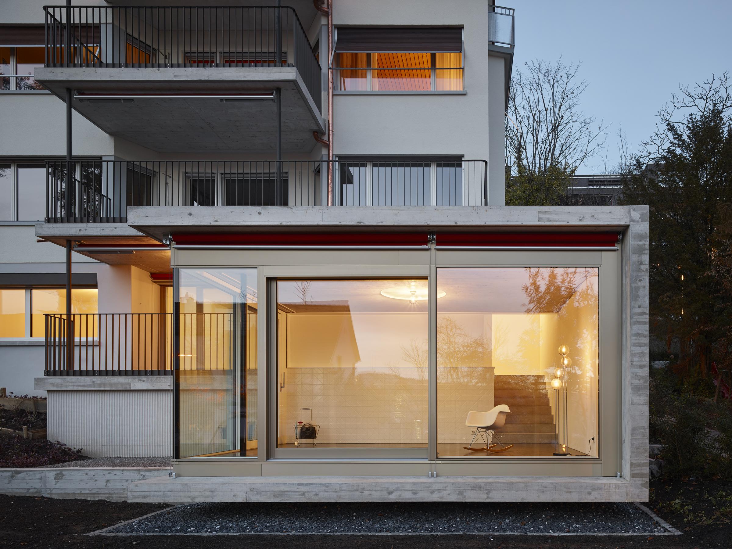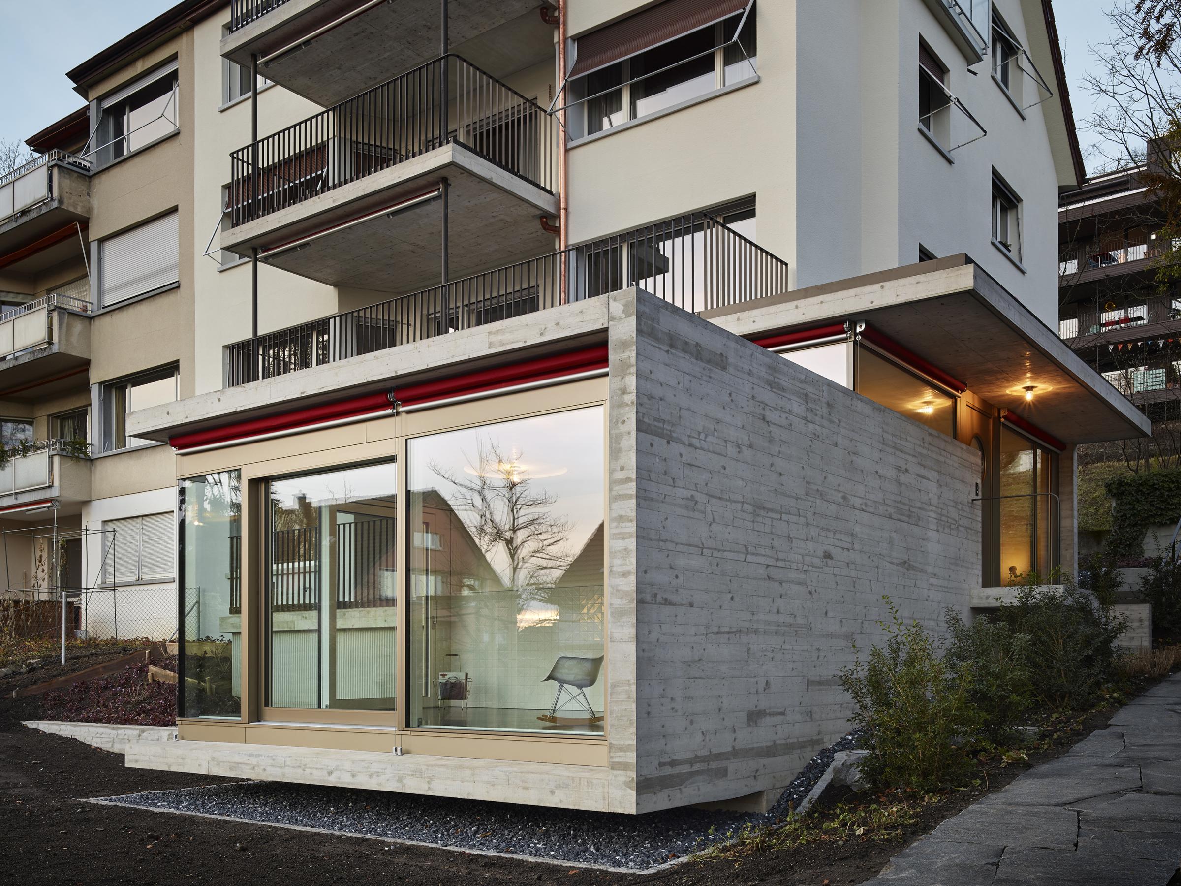 Das in den 1940er Jahren erbaute Mehrfamilienhaus in Zürich-Wipkingen hat eine kleine Gartenwohnung, die nach einem Mieterauszug totalsaniert werden soll. PEK ARCHITEKTEN erhalten den Auftrag, die Wohnung zu erweitern und eine attraktive und moderne Wohnung zu gestalten, ohne dass dabei der Charme des Bestandes verloren gehen soll. Der Anbau nimmt die Topografie des umliegenden Gartens auf und versetzt sich so um ein Halbgeschoss gegenüber dem Altbauteil. Diese räumliche Abstufung macht das neue Wohnzimmer zu einem eigenständigen ‘Kubus im Grünen’ mit viel Individualität. Der Versatz ermöglicht die natürliche Besonnung der hinter dem Wohnzimmer liegenden Räume. Das Dach des Anbaus wird zur neuen und grosszügigen Terrasse der darüberliegenden Wohnung. Sämtliche Balkone des bestehenden Wohnhauses werden vergrössert und erneuert.